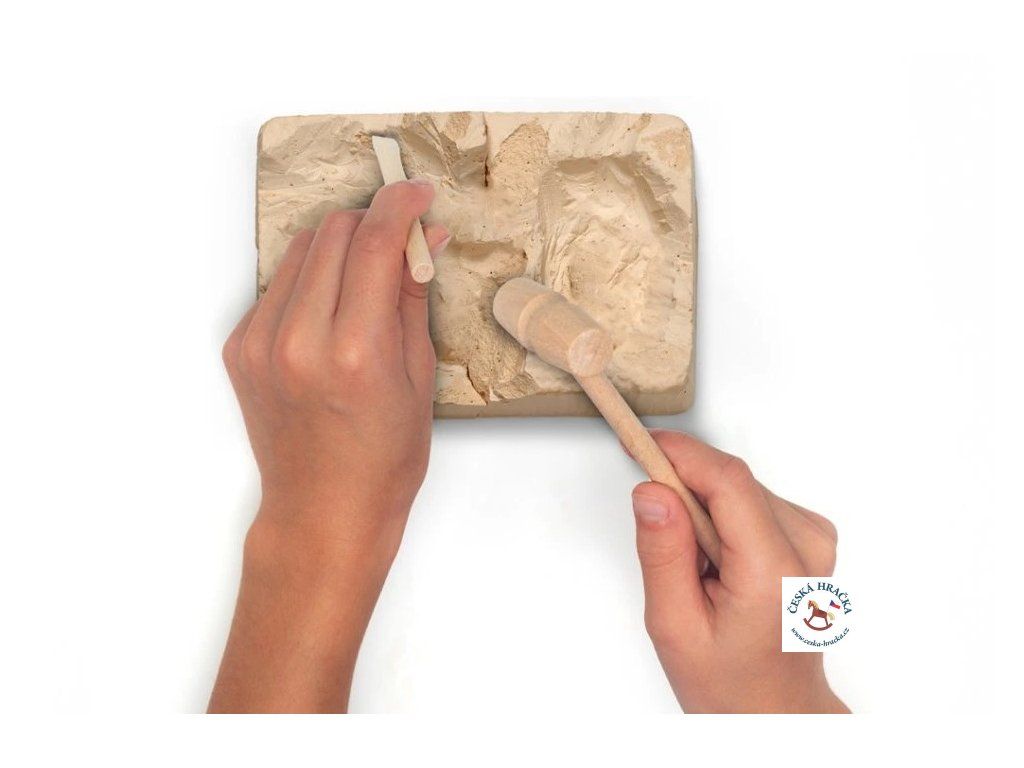 • dřevěné nářadí a blok s vykopávkou dinosaura